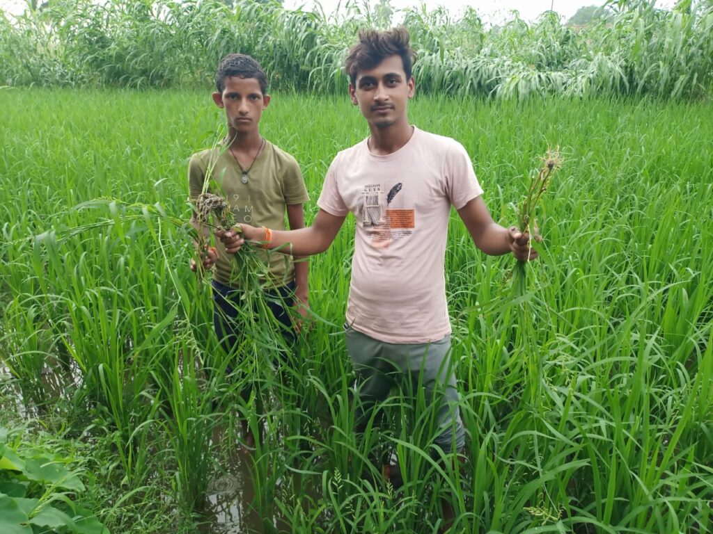 फ़ोटो(बारिश के बाद धान के खेत से खरपतवार निकालने में जुटे किसान एवं उनके परिजन)।